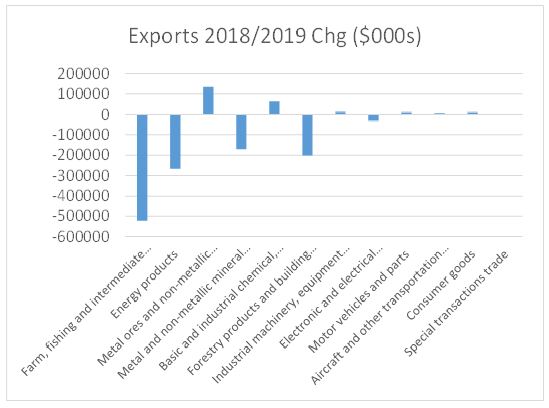 Total International merchandise exports were down -3.0% in 2019 over 2018. Sub sectors that posted increases were: Metal ores and non-metallic minerals (2.1%), Basic and industrial chemical, plastic and rubber products (32.8%), Industrial machinery, equipment and parts (2.2%), Motor vehicles and parts (9.4%), Aircraft and other transportation equipment and parts (237.8%), Consumer goods (13.9%), and Special transactions (1.4%). Sub sectors that posted decreases were: Farm, fishing and intermediate food products (-3.7%) (canola to China), Energy products (-3.2%) (part of the sector wide downturn), Metal and non-metallic mineral products (-28.7%), Forestry products and building and packaging materials (-19.6%), and Electronic and electrical equipment and parts (-25.7%).